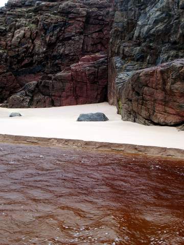 A long thin forward only dance but today it’s been kind of shuffling and joggling in circles and squares; out in the rain on a wide open beach doing that surely vital and fundamental of human activities with the music that is just always there in your head. Take it down into your body. Drama: It’s raining raining all day and what if the outflow of Sandwood Loch rises till I can’t cross it? I’m now looking out through the tent flap south east over to the wide open bowl of the loch catchment; sodden peat moorland pouring water into the loch, Strath Shinary and only one way out for all that water through a darling swirling dark red torrent that cuts through the sand and under the cliff at the far end, the north east of the beach. To cross it is the only route north up the coast without a grand detour inland.