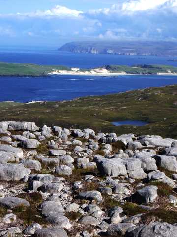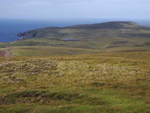 I put my boots on I take my boots offI put my boots on I take my boots off I put my boots on I take my boots off You know they both can make me happy. A large dolphin leaping, just once, fleeting here and gone right in that twinkly orange band from the sinking sun along the water to me. On a high cliff facing west and over my right shoulder the sea also. I can go no further that way. This is it. Up and away across the loch outflow by 9.15. Nothing to have worried about, not today anyway. Out across lovely open rolling moors, down and up deep rocky ravines taking black water west down to the sea. Gentle going between flat rocks and tight grass. Low mats of heather through bogs that needed gaiters but only just. Cheese grater collections of black peat gullies. Altogether benign and easy going stroll. Grey and overcast as I climbed away from Sandwood Bay, by mid-day lifted off and bright sunshine warm breeze. Cape Wrath in bright sunshine and warm breeze! And another shift in gear today: no path to follow, you make your own way around hills and along cliff tops. I was riding it, springing across soft turf, skating the hills, riding the contours. Build momentum on that slope, swoop down to lift over that shoulder, once again just following my nose. All your life you been walking And this is where you got to baby Tell me what you see Lunch high up 230m, Sithean na h-lolaireich, 4 ½ miles by crow from that spot; my destination. Realising by then what today had to be: just another good days walking. That’s what I’ve been doing, carry on doing it. Just 2 things going on while I was having lunch: