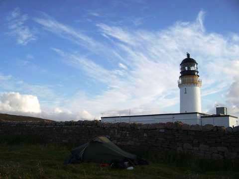 Anyone here was going to get the whole story. If they came within 100 yards I was going to let them have it till they ran away. I was hoping that is, that there would be people here to dump it on and yup; a Coast Guard man father and daughter renovating lighthouse buildings gave me a laid back welcome and cup of tea in their caravan. Just right suffering my story and talk of living out on the rock and spotting basking sharks from the top of the cliffs. I wandered around and gazed out especially at the sea ripping north round the cape and reefs of rocks a little way off, leaving a churning wake stretching on on out towards Iceland and the ships passing on that way, all shapes and sizes riding the current. A clear calm evening left me searching around for a spot with a breath of wind but this wild Cape Wrath still and very midgey; Buzz Aldrin cooking. Looks like it will be a clear night so I might go to sleep fully clothed and set alarm ready to crawl out and check out the firmament in the small hours. Cassiopeia. I’ve spent the summer walking; do I want to go home now? I think I want to go home now but I’m not sure what that means. Home will have changed and I will have changed so it’s as much into the unknown as all of this. But it’s been my summer, I’ve had this summer. It often happens that summers pass; they’ve gone and you didn’t get hold of them. I did get hold of this one, summer 2005 April to August was mine.