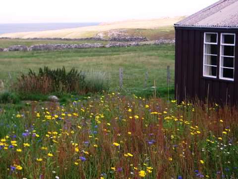 South along the road a couple of miles following above the coast down to the ferry point. Two o’clock sitting on the slipway eating the very last food; oat cakes and apricots. A ten minute ferry ride and coffee in the Cape Wrath Hotel; too late for lunch. And then the urge to get into that blue shining water so check this out: 1300 (?) miles and feeling just so fit and strong and light and empty. Celebration: Running running and dancing on the sand and singing and swimming hard with the current to celebrate the scrawny body. My body has done for me All that I asked And now I’ve got here Hallelujah And boots for walking have brought me all this whole way, tread to spare so second pair not required, draft papers not sent. How can I ever take them off? Time and distance running out now. Due east up from the road and suddenly you’re on limestone, with pavement chunks protruding through tight grazed grass and heather. Schists and Gniesses and sandstone for so long; all very lovely but now a splash of something different. Up and over past Loch Caladail with tumbling stone dykes cutting out across the water, 1 or 2 low hills to romp over and there it is Five forty five o’clock and the end of your walk. This is the end; the gate into the Durness Youth Hostel dancing wildflower garden; open and walk through and it’s all in the past.