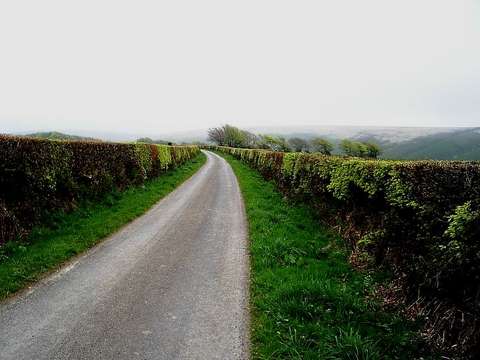 for the next leg, would it pin me to the tarmac. La-Di-Da burger and chips. Diary entry. Wednesday 4 May Round to Barnstaple. Anonymous BnB box room but some familiar comfort in stiff white sheets. Change of energy. Without the wonders of the cliffs and sea. No spectacle but did it get me while I was there? Different walking now, stepping out not the physical working of the cliff path; now more plodding along. The Tarka Trail, long long straights, ebullient veg , robin’s song (telling me not to worry). Clearing sky and a fresh breeze up the estuary. Delight at first stage parcel here and system working but aimless wandering round town over whelmed looking for supplies and needing to find a BnB and stop. Back up to full weight, will these little leggies be able to handle it? -------------------------------------------------------------------------------------------------------- Sun the next morning and roads east up onto Exmoor. This was a key day, another shift. A rung on the ladder of yes I can do this and it’s gonna be fun, pack not feeling too heavy. All morning pushing out hard and delighted. For the first time finding spontaneous singing shouting, Yes! I can do this, this is what I’m doing! Deciding also on a project to entertain me and which would have to be a worthwhile thing: Take regular photographs of the path ahead, the path that I’m following . Capture it and wouldn’t it be a great record of this jaunt. This was my journey. The path, always there leading off and away, a real and imaginary line extending for four months from my now toes. Always this certain amount there ahead of me up to that corner or horizon that I can see. If I can’t see it is it there? Do I create it by reaching and looking over the rise? If I turn around and look behind is it still there? Is the path still the path if I stop moving?