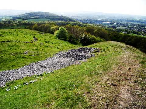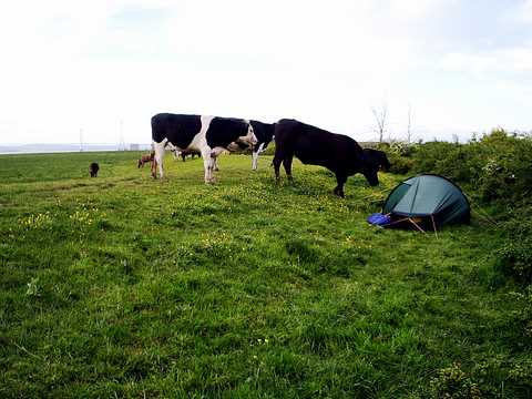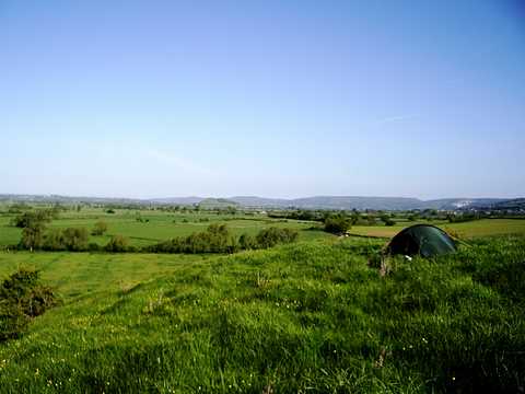 Answer: Cow Castle is an iron age fort and it is thought to be more of a refuge than a power base. Legend says it was built by good pixies to be a happy place. Camped up on a ledge, one of the banks out of the south west wind, quite strong last night. Ecstatic at finding this place. Barnstaple to here, salvation. This is why I came and so lovely I decided to stay, hang around for a late morning start. Blue and warm and a winding path off east through there in a little while. -------------------------------------------------------------------------------------------------------- Bit of a downer after that as you might imagine. (:O:) ooch making a re-appearance and getting stuck and tangled in paths across up and down agricultural land. Exmoor turning into the Brendon Hills. There was a moment though up on top near Champflower Barrow, bright quite chilly and windy, finding shelter for lunch down behind the banks of the earth works dodgy footpaths abandoned for the B3190. Bright, quite chilly and windy. Suddenly a big view north and east along the Severn estuary and across to Wales, standing on top of a pile of those huge slick black plastic covered straw round bales for a better view and photo. Yeah, progress but by the afternoon I think the most exhausted yet. Staggering in that can’t walk straight way delirious down the road feet throbbing, pushing to reach a camp site under the Quantocks. 7 o’clock and another mile in evening sun after finding the Youth Hostel full up. Back aching as my body is starting to change shape. So an enforced break there, lying leaden in my tent all the next day. Dozing with Caravan people coming and going and the dancing sunlight through the trees on the orange tent insides. Sun and chilly wind all day. Buttercups. Other world of Texting. Matthew Dave Mate I thought you would like to know the following: Jordan’s un-borne child is fine. Beckham’s sacked nanny gagged by court order. No need to reply. Mark How r u r u cold at night where r u what have u bcum have you a beard do u wear dear skins is there a god will she answer my prayers tell me oh great guru John No deeds to do no promises to keep John Both less and more Howard Having an opportunity 2 journey and listen 2 it for such a focussed time must feel strange scary and exciting with so much discovery and freedom. Stay safe. So much life is often lived asleep. Enjoy and send a wish to me at 1pm. Lizzie Hello what hat are you wearing?