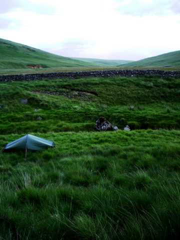 Monday 4 July I’ve walked from Land’s End to here. This is where I’ve walked to -just here- this very spot. This is where my life has arrived at. This moment this spot this step this breath. It’s what I do, I get up in the morning and I walk. I walk all through the day and in the evening I stop. I put my tent up and wash, maybe in a stream. Collect water, change into warm evening wear and cook. The joy is in the detail of this kind of life. Not really doing very much so each little thing has a significance. Breaking camp and making camp in a very particular way, routines to throw myself into and delight in. Getting organised (super duper). It’s important! There are 2 lighters that live in the draw-string bag with the stove. In there really to light the stove. Either will do when I reach in for one. The stove is set up, fuel bottle attached and primed with a few good pumps, legs out and level, wind baffle ready to stick around it. Now I know the lighters will be there and the stove will be going in just a moment. There it is. Hey, I’m on top of all this. I arrange my seat to face the setting sun, I stare in disbelief at the beauty of it all. I read my book, David Balfour meeting interesting characters and getting into all kinds of scrapes and on land and sea not so far to the north of here. I eat Chilly Pork and Leak Sausages in Bulgar with Mature Cheddar and Apricots. I enjoy a warm constant breeze from out of the sun and not a single midge. Not a single cloud. I’m out north west of Muirkirk. Polkbock Burn. Open wide grassy plains melting into soft gullies, green and green and at this moment sublime benign and mine.