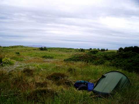 Horizontal in tent at 9(21)05. A particular kind of getting there day, through raggedy farm land and urban-ness. Galston to Kilmarnock and down to the sea. Tired and pushing on mostly on roads, more or less following the course of the River Irvine. Content to be doing that, and aiming for a spot on the coast between Troon and Irvine, looking on the map to be a wide sandy bay. Wild enough hopefully to find a camping spot and that it is. I’m down between low sand dunes among spiky grass and heather. The sound of sea and surf 300 meters to my west and the throbbing and groaning of some industrial process from factories the same distance inland to my east. Great to be back in tent after a night in a dismal BnB in Galston. A hot bath and a good sleep though. Current primary ailment is painful throbbing feet. That bruised tenderness in the soles persisting and bad especially after lying down and wears of but slowly in the mornings. Not so bad as to slow me down though and not really worrying. A Slight Reprise of Haemorrhoidal irritations also. Ignore. Ha! Me I don’t have Piles anymore. So today a very different kind of day to the previous 4 out in the hills. Scottish hills for walking, just fab so far, but lowland Scotland not so. Few footpaths and those that are marked on the map are very often overgrown or fenced across. Broken old styles and dead ends. I guess it’s; why walk around these parts when there are so many groovy mountains to tramp? Ancient rights of way, which is what most footpaths are I think, would just get lost and disappear if no one demands to use them. Not satisfying for the likes of bourgeois rambling me though. Again in Style. Across the Southern Uplands, getting hold and making them mine, up and over and down. 4 days and nights out in the wilds and another fantastic surprise and discovery. Very into that wide open grassyness. Almost Dances With Wolves type country. Must return one day. Here’s the route if you want it. (Here’s the route if you want it dear). Not interesting I think if you don’t have a map to look at. If you have and are so inclined, just so exciting! Following the River Annan north and picking up the Southern Upland Way at Beatock Hill south west of Moffatt. Following this to camp the night near Rivox then over to Daer Reservoir and crossing the A702 at Overfingland. Getting off the path to dodge the weather and camp in the valley between Cold Moss and Crooked Bank. Up on to Lowther Hill to rejoin the path and on down through Wanlockhead and the Wanlock Water valley. Leaving the path to carry on north east to the B740 at Spango Bridge. From there due west over Lamb Knowe to camp near Spango Water east of Fingland. Winding path north west from there across to Muirkirk and from there good bush-whacking north west to the radio mast at Greenfield and the road out. And I did stay up and listen to Pink Floyd down behind Lowther Hill. Till 11.24! Snuggled in my bag actually while the tent rattled in stormy wind and rain. All very moving and too excited and revved up to sleep after that so a tossy-turn night. Part of this seaside camping experience has been to arrive and make camp while convoys of throbbing Chinook helicopters, escorted by smaller military looking helicopters, pass back and forth directly overhead perhaps the same beasts I met on the cliffs north of Newquay day 5 . They ferry it seems the leaders of the 8 great nations of the Earth and their entourages from Prestwick to the summit G8 at Gleneagles. Yes that’s the day I’m here; it’s all going off up over there somewhere. Actually an episode from Star Trek; the leaders of the planet assembled along a table to make decisions. Little Ball floating in space, Human Beans. “Long ago our leaders were unable to decide, unable to choose a course of action that would allow our world to sustain and nurture us. Those that survived the ensuing calamities were forced to burrow into the planet and have lived for millennia below ground, etc” Or “Long ago our leaders came together and together chose a path that enabled the whole human race and the planet to flourish. We now live in peace and co-operation on many planets across the Galaxy. War and suffering have not been known for millennia.” (“Until you Kirk came along with your EGO thingy sticking out”)