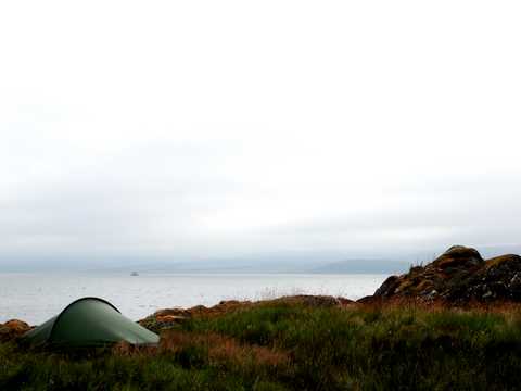 Thursday 14 July LOCH SCHAMMADALE. Skipness – Tarbet – Lochgilphead – Kilmichael – Ford – Loch Awe - Kilmaha – Dalavich – Loch Avich – The String of Lorne – Loch Scammadale. Oban tomorrow. Oban and I think maybe two days off? Certainly one. Perhaps Friday and Saturday night in the Youth Hostel (must ring ahead to book if I can find a signal tomorrow morning), then Sunday just cross over to Mull. To Craignure and get into the campsite there. Just do that on Sunday. Ready to get going into the hills of Mull on Monday. That’s the plan. This part of the world, Kintyre, Argyle and Bute. Low hills and big forests and a lot of water. Green and mist and rain. Getting into it finding it and finding a bit of a claustrophobic feel especially buried in heavy plantations. Not been up on top and seen the spread. But a wondrous open walk this afternoon. From Loch Avich up northward following an old herd road, sheep to Oban. The String of Lorne (Sreang Lathurnach. Lorne being the ancient name for these parts), a fancy and romantic path to be following. Over past Loch Na Sreinge and down through the enormous steep gully of Alt Braglenmore. Heavy rain all the way and low cloud sitting just above the tops of the hills, the heaviest rain I think of the trip so far, so properly into Scotland. Into tent and retreating from the weather by 5.00 on the grassy shore at the eastern end of Loch Scammadale. Little out of the way loch nestling between steep grassy hill sides. A couple of houses a quiet (1 car so far) road along the northern shore. Evening 9.15 fed and warm and reading Robert Louis Stevenson. Hissy mountain rain and the ripple of the lake shore. Pic 85 01