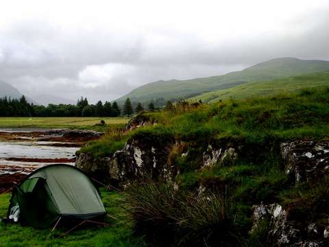 A wide open wild glacial U valley. Huge swooping up both sides. A mixture of solid forest tracks and very boggy and rough tussocky-ness. Hillside below Beinn Bheag running with countless instant streams through the tussocks. Actually quite a struggle with this pack, hugely physical stumbling and difficult to find a rhythm. Extra concentration when you can’t see where you’re putting your feet. I think impossible or many times more difficult without my stick. Curling clouds heavey rain and bursts of sun that had me squinting up at the scree sparkling on the flanks of Beinn Bheag; lively weather. Came across a clearing in the forest, an open strip 50 yards either side of a stream; Ceann Chnocain. Stone houses with peat roofs, chimney smoke blowing off into the trees, farmers and families in ragged plaid with goats and chickens and wild hairy cows. A dam in the stream to make a fishing pool. Potatoes and cabbages. A hard life out there, they didn’t see me. A long walk it was through Glen Forsa and down to the coast. Very boggy forest path often disappearing then a straight wide gravel track out following the River Forsa. Three quarters of the way to the top now, time and distance. That makes a change, no longer an endless summer. Had a sense today, unwelcome, that I was thinking more about the end, moving into finishing mode. No longer just living this life but somehow thinking beyond it and all this might actually soon be over. (Perhaps it’s the hard work wet weather making it more of a task). Nearly done but I don’t want that! Just want to be here, present and breathing in this outrageous beautiful country-scape. But the truth; I do have to go home and if I can come to terms with that somehow, it’ll be less of a shock. But actually just deny it. Now though. Raining hard and getting dark and washing up not done. Shocking! If I left it outside for the rain to clean or did it in the morning that would be the first time. The first time! Morale, standards plummeting. Tobermory tomorrow or Wednesday. Forecast rainy-er.