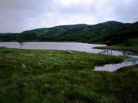 I came across a hot combination today. From the bottom upwards: Sphagnum; a lumpy layer across the ground and probably extending deep turning to peat then bedrock. Soft grass; thinly spread growing up through the Sphagnum, up to 2 feet. Heather; small thin clumps spread evenly amongst the grass. Bell Heather; smaller thin clumps spread evenly amongst the grass. In flower Bog Myrtle; evenly spaced low bushes, 2 or 3 feet high. 1 per square meter. Bracken; occasional widely spaced low plants, 2 or 3 feet high. Dwarf Birch; Low trees, 4 too 6 feet high. 1 per 5 square meters. Level ground, firm, dry and even under foot. Thinking about moorland recipes (obsessing in fact). This one was kind of intoxicating especially with the smell of the bracken and bog myrtle in the afternoon sun after rain. Every bit of moor land and mountain that I’ve walked across has had a different combination of flora. Each a different experience to all the senses and the emotions. Some an infuriating obstacle and struggle, others a stroll through the garden of earthly delights and all points in between. These are some of the basic ingredients: (Design your own moorland.) Sphagnum Heathers, Bell Heathers, Grasses and Sedges tussocky or otherwise. Bilberry and Bracken. Gorse. Dwarf Birch and blasted Oak or Rowan Then lots of extras thrown in to spice things up. Maybe Tormentil and Lady’s Bedstraw, Bog Cotton and Bog Myrtle, Orchids and Bog Asphodel and Hair Bells. So many things. Rocks maybe, little ponds and sinks and of course the lovely black criss-cross deep peat gullies. Feather Bed Top. It can be wet wet like these 2 days on Mull, alive and sloshing and Woh down you go into the sludge or bounce across the Sphagnum. Maybe dry and sandy like the New Forest in summer. I enjoyed hugely the cocktail on the Bowland hills back in June with a rich Bilberry Heather balance similar to the Black Mountains, against the black of the open peat gullies. On the Southern Uplands north west of Muirkirk these peat gullies were full of rivers of Sphagnum. The Lowther hills around Wanlockhead; grass and grass glowing green with dark Heather patches and stripings. So presumably it’s all to do with what goes on there and what has ever gone on there: Sheep, deer, people and burning and the geology below, porosity of the rock gradient, topography and the weather, sheltered or open. Altitude attitude all mixed up. It’s a treat to get onto a new hill to see what the balance will be. Add to this all the animal input as well of course: Larks, Meadow Pipits, Wheatears, Grouse, Curlew, Oyster Catchers, Hen Harriers, Buzzard, Gulls, Hares, Deer, Sheep, Zebra, Ticks, Slugs, Crocodiles, Toads, Wildebeest and multitudes of insects and these days always a Rookery; strange that. Today’s hot combination came accompanied by showers and occasional sun along the valley of Loch Frisa. (Also I think and could it have been a Sea Eagle?). Just a small island, an acre or so in a sea of dense deep grass and heather. I wonder if I could ever find it again. Arrive when the heather is in bloom, (4 weeks time?). So much time spent alone in these heathery parts and endless entertainment to be found and I’m out here all this time just swimming through all of it. Up from the sea shore along to Salen for a pint of milk a meat pie and a banana. On the road north west through Glen Aros and above the western shore of the Loch. Heavy going disappearing path but worth the struggle. The hills walking north becoming more and more lovely. Today lava stone tables lined up with flat tops and little hanging cliffs. Such a contrast to the huge sweeps of yesterdays glacial valleys and granite peaks. Shapes of hills have gradually been seducing me all the way up. This afternoon was long flat Caoldairidh; from my passing angle a huge flattened out Sphinx sitting at the head of the valley. Add to the list of places to come back and have another look at. Walk again the path but also; I’m beginning to get a little bolder and strike out more, bush-whacking confidence returning. Anticipating the worst and then taking what comes. I think finding and hoping that that Skipness Kintyre moor-land cocktail was about the worst. There was some slow heavy going today along the shore of the loch but that was Ok. 9.50 and camped right on the shore of the overflowing Mishnish Lochs.