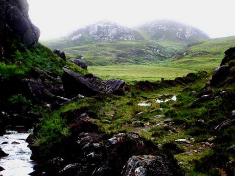 Friday 22 July MOIDART Found something today, a good bit of what I came out here to find. Up on top of Meall a Mhadaidh Mor,. Half way from Ardmolich too Roshven. Camped up in the bright evening, 8.45 and the sun still 2 fingers above the horizon. Looking north west out to what must be the big hills of Skye. The Cuillins and north down Irine Burn, my route out in the morning. All this through fine mesh netting as under siege again. Tent up on flattish coarse grass and Sphagnum amongst rocky outcrops trimmed with bell heather and tormentil in flower. Top of a knoll, 430 meters surrounded by stormy sea landscape lochens between ridges and rocky summits. A plateaux all cut into and chopped about and glowing green in the perfect all alone high on a mountain sunny evening. Wind dropped to almost nothing, no sound but the stream gathering off the side of the hill and thick swarming mass around my head. They are very cleverly finding their way through the zips of my zip off trousers. So up here at the end of another day of outrageous paths and with the added delight of the longed for bright sunshine. Not too hot, bringing all the colours to life and lifting the lid off. Again only 10 miles. Up on the road early, by 7.30 which is the earliest yet. Across Kentra Moss and breakfast at the grooviest spot (sorry). Breakfast at an enchanting spot; a whirlpool in a rocky gully spanned by and ancient bridge beneath which the dark treacle waters of Loch Sheil tumble and churn on their way out to the sea. Loch Sheil stretching I don’t know; 15 miles off west beneath towering peaks and all draining out through that dingily-dell channel with fairies dancing. On along the road following the River Sheil north, round past Castle Tioram passing camper van folks bleary eyed in the car park shaving in wing mirrors and round to follow the southern shore of Loch Moidart. Now this was a quite a scary path and a moment of sobriety and concentration. I’ve been pondering this route north up to Mallaig, conundrum (puzzle, mystery, challenge, poser, problem, riddle); so much winding in and out between water and high rocky country. Can I go straight? Cross the water? Cross the mountains? Or take the road that suits the internal combustion but what a dismal solution for walking through this outrageous country, denial of the challenge of the hills. But I’m still wary of striking out across this wild country and still looking for paths. No paths on the map here going in the right directions. Is it possible to just decide where I’m going to walk, A too B on the map and just do it? Look at the contours, get out my compass and shoulder my pack. This morning stepping out in hope to take the path round the southern shore of Loch Moidart; on the map that little dotted line ends half way along. If there was no way through beyond there then I would have to turn back and take the road, boring and it would take most of the day to get round to where I could be by lunch time. Contours not looking too bad though and the map showing mud at low tide so I might be able to get down and walk along the shore. I was reassured by a man mowing his lawn at the mouth of the loch that I could get all the way to Ardmolich at the loch head, though it was “a long way along to there”, “That’s Ok I’ve got all day”. What would stop me? Rocks and cliffs and tumbling dense and tangled steep forests. Lions and Tigers and Bears. Some country I mean actually is impassable. Just keep going, don’t think about it, only know that I don’t want to take the road. Last option; Failure. But the path was scary and perhaps about the limit of what I could do with my pack. No easier than that descent with Mark into Glen Sannox on Arran 2 weeks ago and today I was on my own. (Sensible?) Very beautiful and fairy land, scrambling up and over and round mossy boulders buried in bracken and old twisted oaks on a steep slope above a drop into the clear blue loch. Slow and exhausting and a thousand opportunities to trip. How quickly could I get my pack of as it dragged me to the bottom or the ignominy and sad end to the trip if I had to ring on my mobile to be rescued with a bone sticking out, perhaps that’s what happened. There were moments, quite scared and doubtful, I’m going to hurt myself, but more scared of giving up and retreating and how disappointing and draining to my sense of progress and success that would be. So trying not to think about it and keep going, drawn on by the sunny hopeful day and determination and I think to test myself; how much of this Scotland could I handle, lets have a look. But of course it was all fine. Fuss about nothing and by mid-day when I reached the end of the path the tide had dropped enough to let me slodge across mud and bright green sea weed. Just eating it up and feeling triumphant. In celebration: Naked mud bathing; the sublime rich soft and sweet smelling estuary mud and bright clear sky hot sun bright green sea weed rocks and trees and wind with the fresh water flow of the Moidart River plunge. Something else! Summertime supreme confidence and conquering hero. Slurp and splodge. (No shower since Oban and mud bathing I think I should make a habit of it.)
