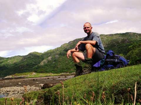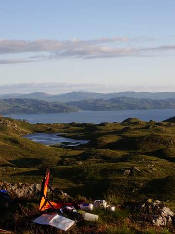 I absolutely have got to here DAY 92. Three months and a bit out from Land’s End. 3 months of walking. How can that be? Leading for years and years a regular working 5 weeks leave a year kind of life and suddenly look where I find myself: Sitting on a little heathery knoll a few feet above the salty wet grass of falling tide Kentra Bay. Near Arivegaig 21.00 and the sun still dancing on the rocky hills of Ardnamurchan all around. Inland to the east the pointed top of Beinne Resipol 845 meters nosing out of the clouds. The first sun and blue in over a week with the sky gradually opening out as I made camp here and cooked. Ardnamurchan, and I have to say once again; the best walks and most intoxicating landscape yet. 3 months and getting better and for the first time ever I just saw an otter, a sea otter lazy swimming along the shore just here below where I’m camped. The old roads, herd roads or tracks into remote settlements now deserted, these are just so great to walk. The roads that never became roads. Routes that were forgotten when the local economy changed and why go over the top when you can zip round on the tarmac. They take you on a winding route across wild country, often a firm and even graded track sometimes becoming indistinct across marshy ground adding to the variety. You get a sense of the ages, time past when this was a busy path and the hills were full of people. Main roads for perhaps hundreds of years before villages were cleared or sea weed no longer gathered or lead no longer mined. The best routes through passes and across difficult terrain. So through Ardnamurchan; Kilchoan to Fascadale and today along the road too Kilmory and Ockle and then the track over to here. A lovely winding path in swirling low cloud through a labyrinth of rocks and bogs and steep gullies. Up into the cloud so taking a compass bearing and trusting that path he knew his way. Looking at the map this was the main route in and out of Ardnamurchan from the north but no way for a cart so everything in by mule or on your back. (Did they have mules or was that just in the Mexico gold rush trotting feet dangling no stirrups with big ears and a wide brimmed white hat?) Thousands of years, people wanted to cross those hills, back and forth finding the best way, easiest pass and gradually level it here, shore it up there and it becomes a path and then maybe a track and even a road. Paths and paths. You set out to walk from one end of the country to the other. Can’t help but get a little obsessed with paths. Actually my tramping feet pulling the whole country underneath and past me. Around three this afternoon, gently descending on a firm wide graded track, still quite high dropping east towards Kentra Bay. Winding through turbulent rocky hills, grass and heather, thick bracken to the left before a drop off into a wide bowl with a lochen nestling. A ditch along side the track to the right beneath the steep bank rising away with hanging low birch and oak. Grey and overcast. Frustrated today though. I set out to walk 15 miles, do my 15 miles, keep that thing going. Just didn’t seem to cover the ground. Stopped at 5.00 pretty tired on twelve and a half. Sense of needing to push on. I’m coping I think with this country but perhaps by slowing down. That’s Ok, I want to cruise and enjoy it but there’s a long way to go yet. Bit puzzled by the route from here up to Mallaig. Roads skirting lochs and big lumps of rock. Looks like it’ll be quite a lot of roads but we’ll see. Wouldn’t it be nice if it was a sunny day tomorrow but have to just describe a joyous little rest-time ritual. Walking along and blimey need to have a rest right now so I scan ahead for a spot to collapse where I don’t have to take off my pack. If it’s dry then just a tussocky mound or bank ready for a weary traveller beside the path or a round smooth rock wide enough to accommodate the width of the pack behind me. Approach, sidle up backwards, aim and down I go preferably not too low so I can get up again and not roll around with legs in the air beetle. Details like this, rituals repeated umpteen times a day, it’s what this outing is made of. Here be the recipe for that almost thwarted Ardnamurchan supper yesterday evening. Chilly Ginger Salmon and Apricot Noodle De-Lux.